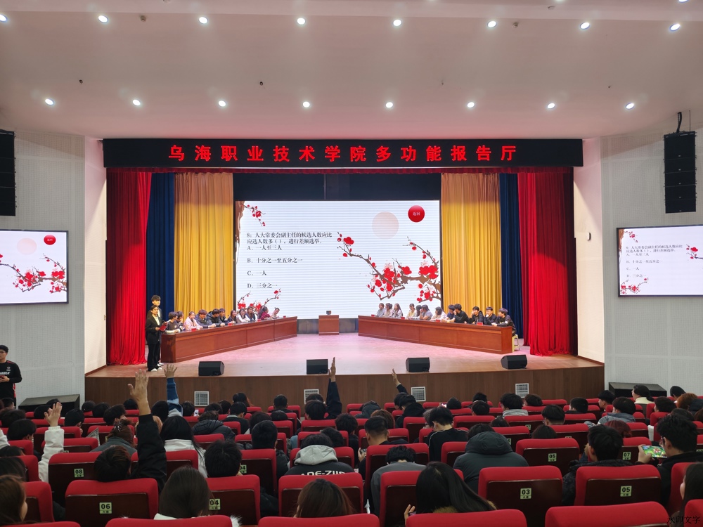 12月4日,时值国家宪法日,乌海职业技术学院报告厅内气氛热烈,由宣传统战部主办、电力工程系承办的2025年“青春无极限 法治伴成长”法律法规知识竞赛决赛在此举办,学院宣传统战部部长武俊丽、电力工程系主任周红梅出席活动并为获奖队伍颁奖。