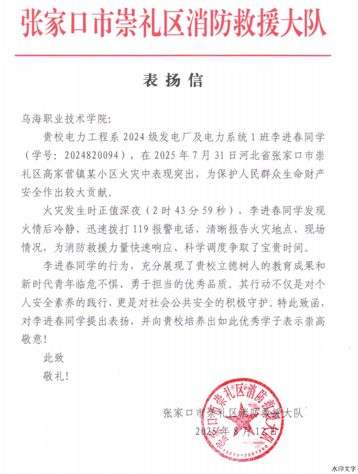近日,乌海职业技术学院收到来自河北省张家口市崇礼区消防救援大队的一封表扬信,对该校电力工程系2024级发电厂及电力系统1班学生李进春在危急时刻挺身而出、守护群众安全的英勇行为予以高度赞扬。这一事件不仅是对李进春个人优秀品质的肯定,更是对乌海职业技术学院电力工程系坚持立德树人根本任务、深化教育教学改革成果的生动诠释。