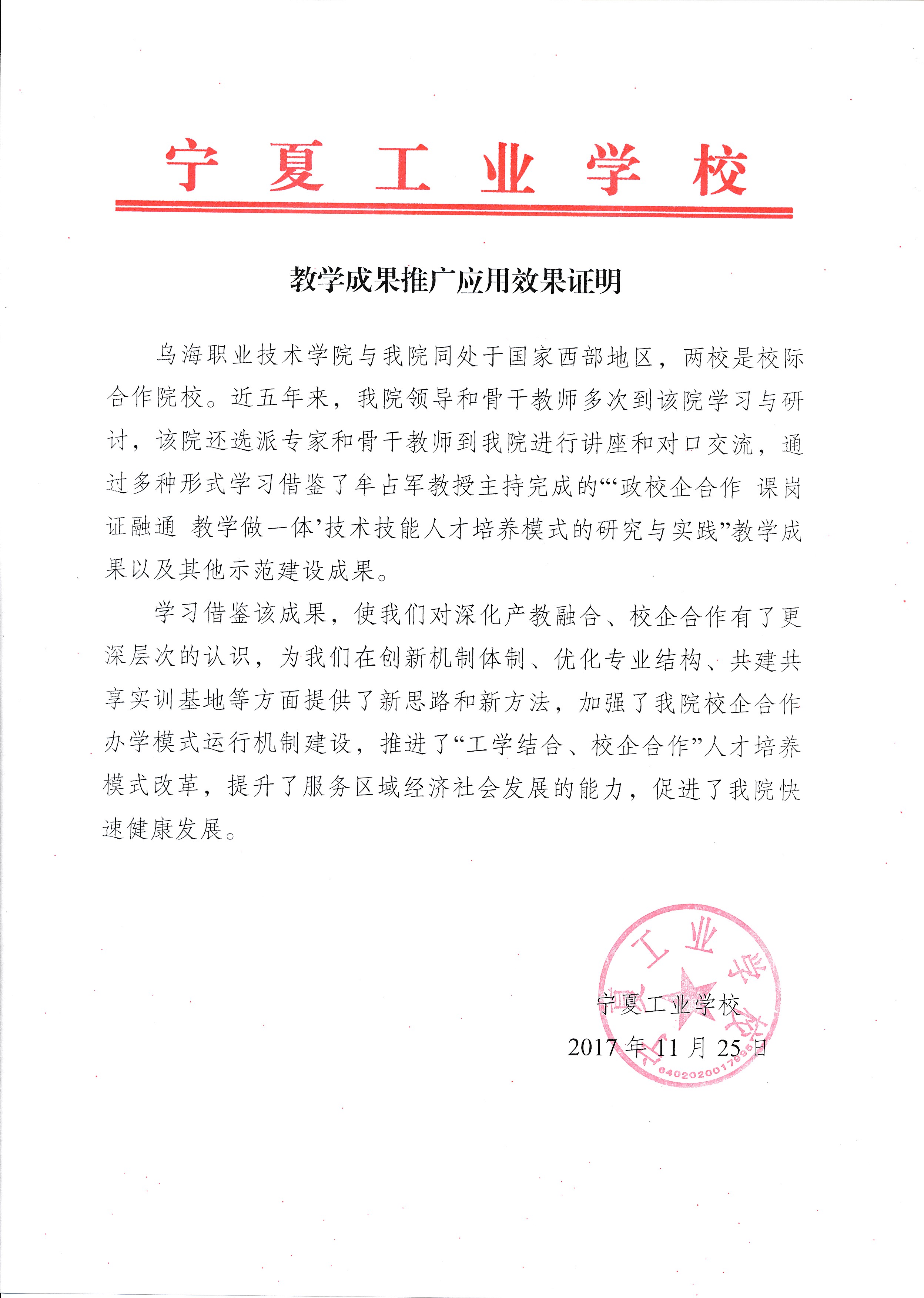 教学成果推广应用效果证明(宁夏工业职业学院)