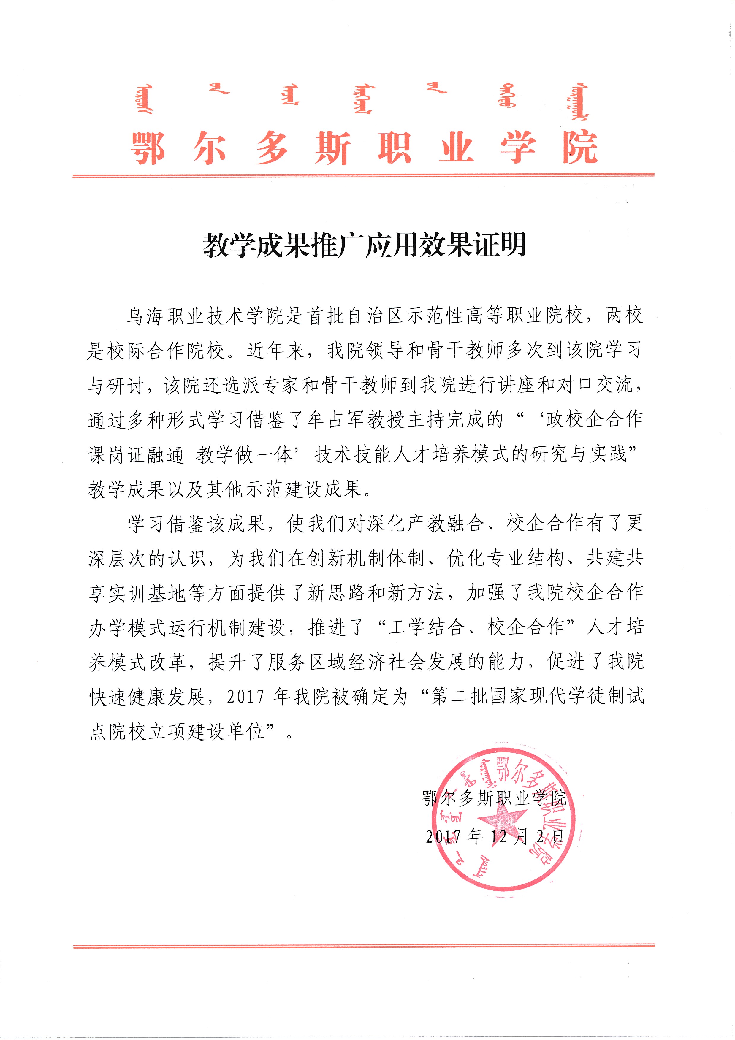 教学成果推广应用效果证明 (鄂尔多斯职业学院)