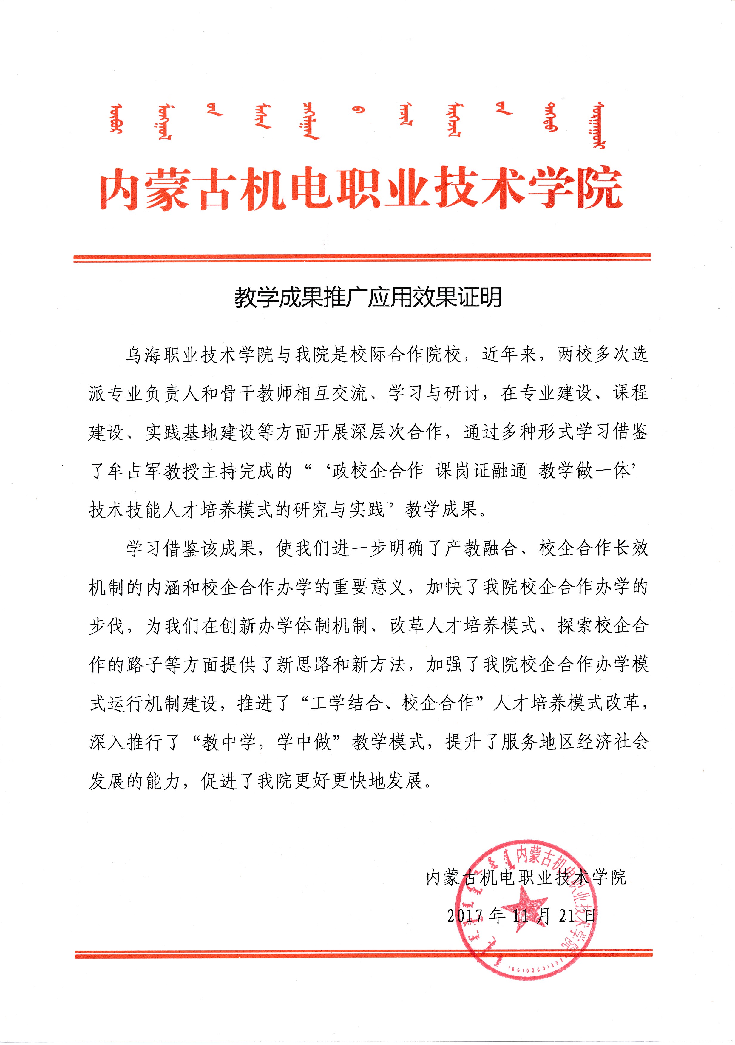 教学成果推广应用效果证明(内蒙古机电职业技术学院)