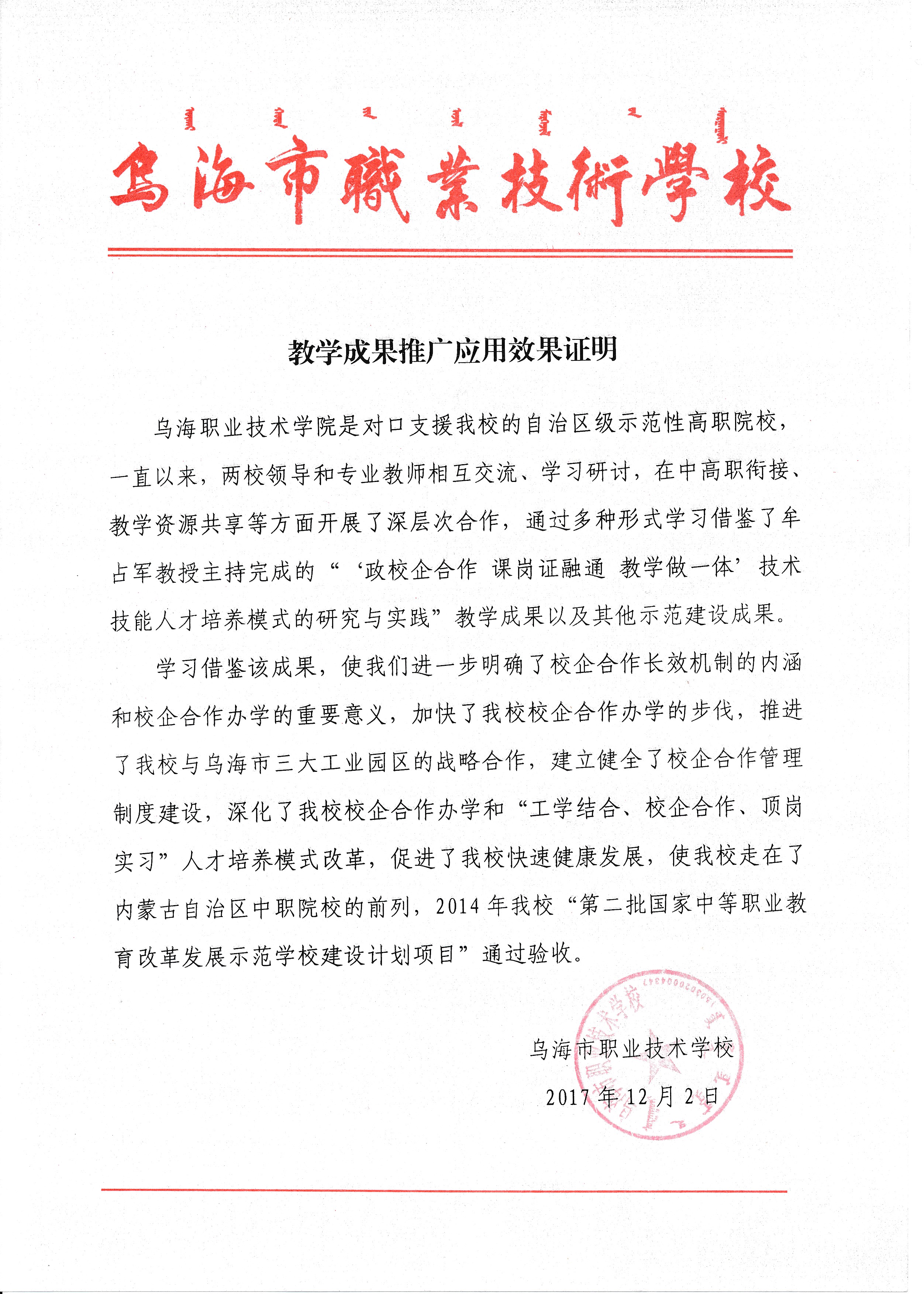 教学成果推广应用效果证明(乌海市职业技术学校)