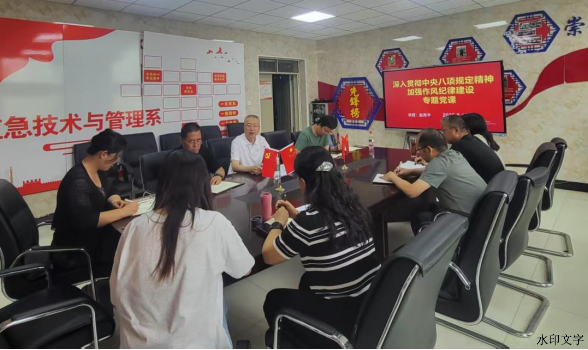 赵秀平强调,在深入贯彻中央八项规定精神学习教育中,应急技术与管理系党总支要深化学习教育,筑牢思想根基;聚焦风险防控,健全制度机制;强化监督执纪,严抓日常管理;培育廉洁文化,融入人才培养。全体党员干部教师要带头学深悟透、身体力行八项规定精神,将严明的纪律和优良的作风转化为立德树人、干事创业的强大动力,为学院高质量发展做贡献!