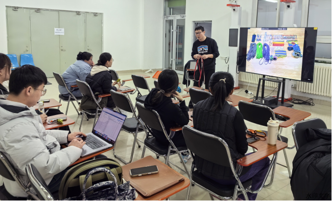上午的培训以攀岩基础知识讲解为主,孟健老师凭借丰富的行业经验与专业资质,将复杂的理论内容讲解得通俗易懂。课程开篇,孟老师从攀岩装备切入,详细介绍了攀岩装备的分类体系,重点聚焦安全防护类装备展开深度讲解。针对安全带、头盔、锁扣等核心装备,孟老师不仅清晰阐释了其设计原理与选型标准,还通过现场演示的方式,逐一拆解了装备的正确穿戴、佩戴方法及检查要点,强调“装备安全是攀岩运动的第一道防线”,要求每位学员务必掌握装备安全检查的关键流程。