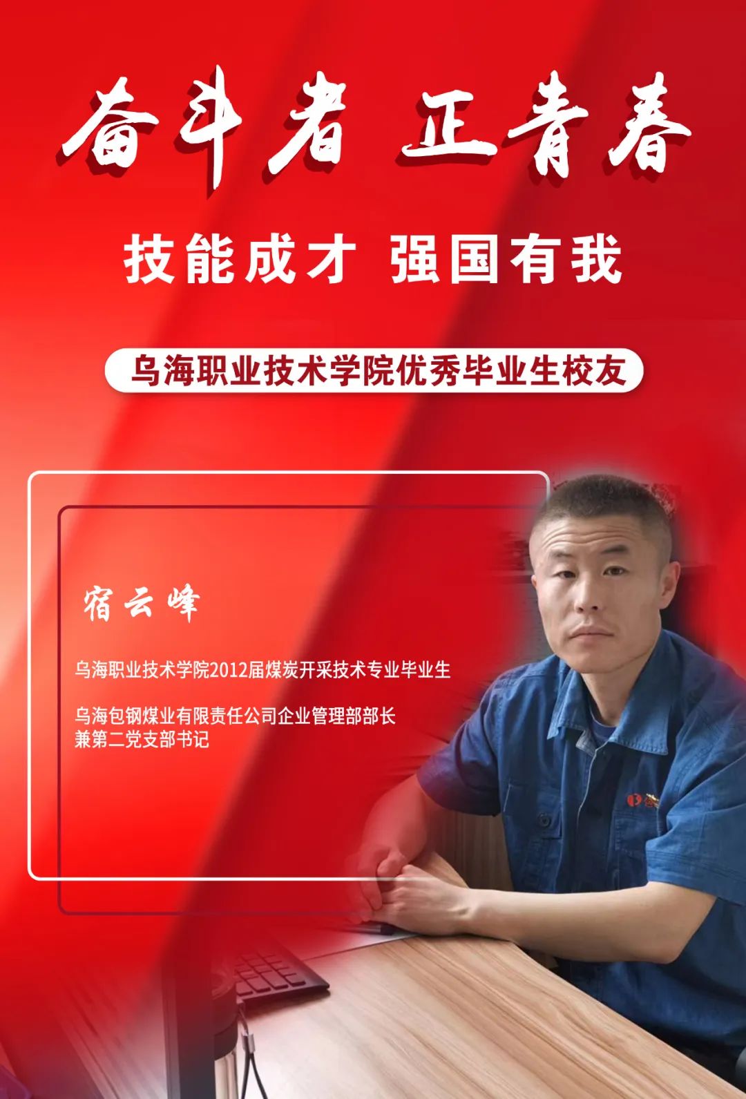 2009年,宿云峰以优异成绩考入我院矿业工程系煤炭开采技术专业。在校期间多次获得奖学金,荣获“三好学生”“优秀毕业生”。毕业后,他先后在神华能源集团、鄂尔多斯伊泰集团、鄂尔多斯康宁爆破公司等单位工作;到乌海包钢煤业有限责任公司后,他从基层踏实干起,逐步成为骆驼山煤矿二号采空区项目生产副矿长、企业管理部部长。