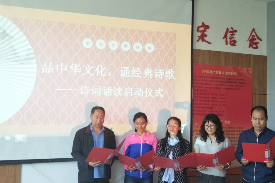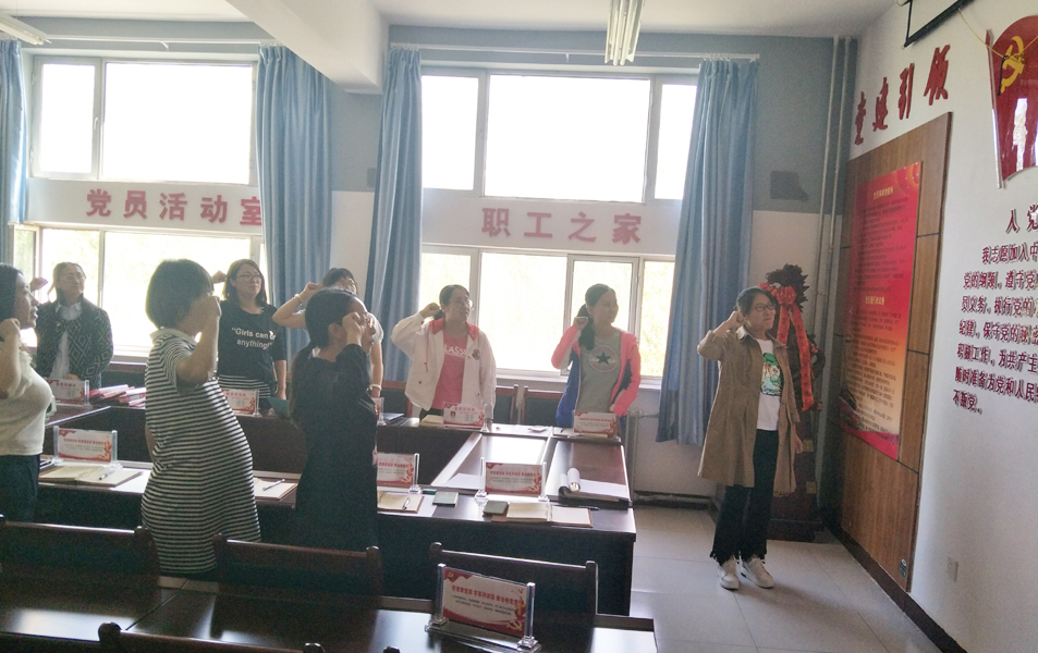 活动中,首先按照主题党日的规定程序,完成了唱国歌、重温入党誓词、学习党章、交纳党费等内容。接着开展了红色经典诗词诵读活动,老师们声情并茂的齐诵了经典诗词选篇,许红霞老师通过诵唱的形式为大家带来了作品《长征》。