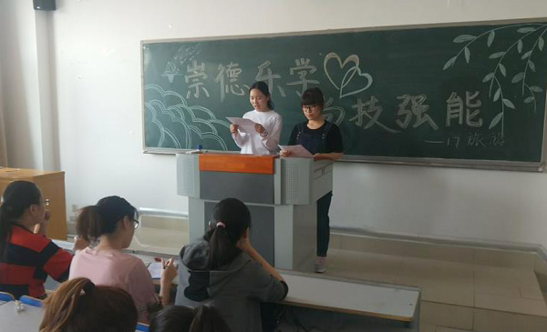 校训是广大师生共同遵守的基本行为准则与道德规范,它既是一个学校办学理念、治校精神的反映,也是校园文化建设的重要内容,是一所学校教风、学风、校风的集中表现,体现大学文化精神的核心内容。为了更好的贯彻执行我院的方针政策,加强学风建设,同时使我院同学在良好的学习氛围中提高自身修养,增强学习意识,努力成为新时代具有一技之长的大学生。近日,管理与旅游系开展了以解读校训“崇德乐学,尚技强能”的学风建设系列主题班会。