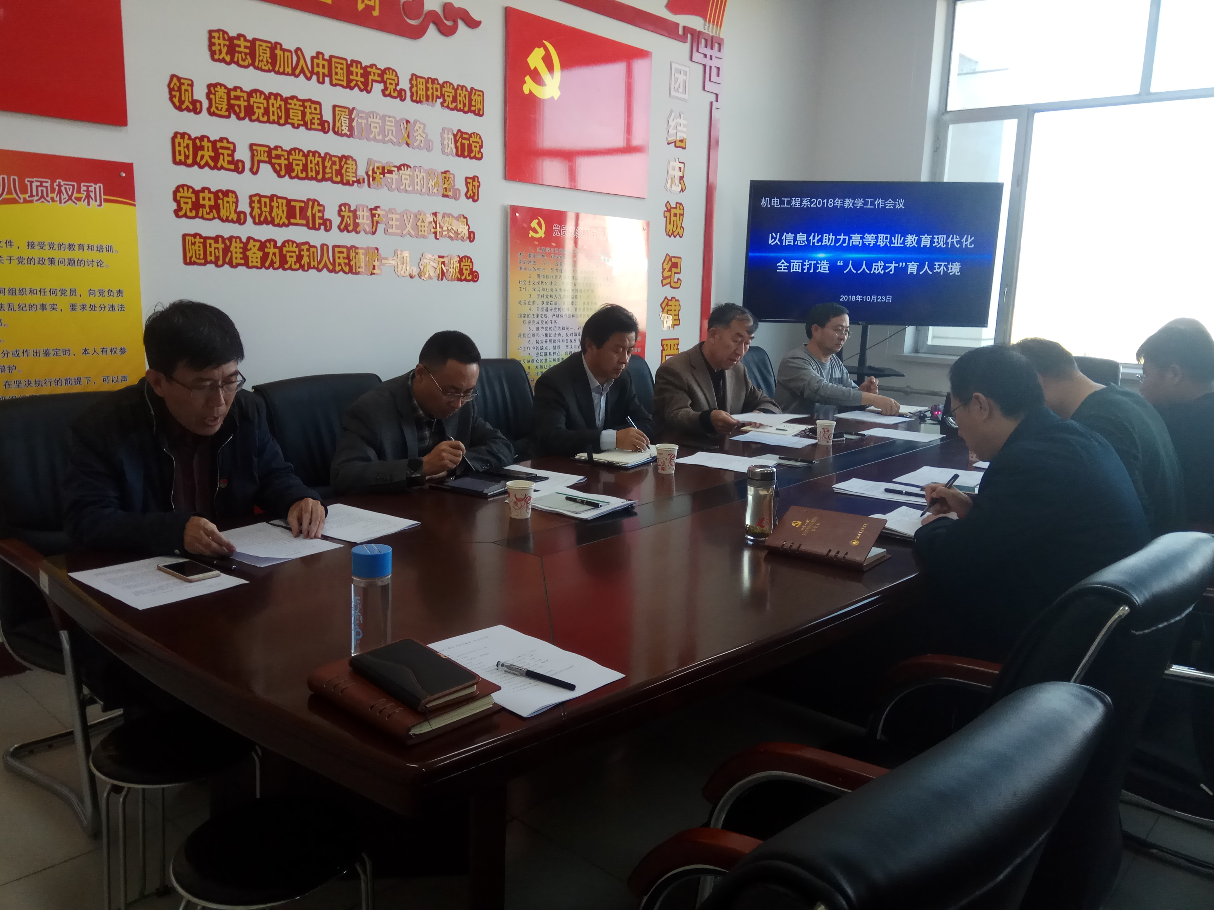 10月23日下午,机电工程系在1B409召开2018年教学工作会议。学院党委副书记、院长牟占军、党委委员、副院长李峰、教务科技处副处长李永杰和机电工程系全体教职工、外聘兼职教师、企业代表、学生代表参加了会议。