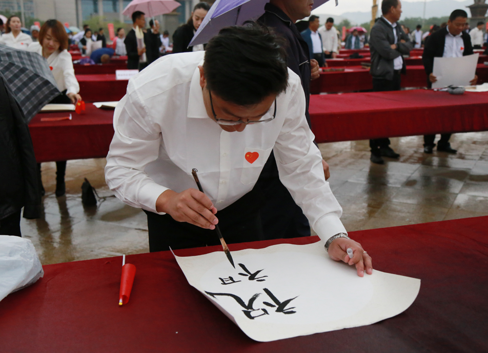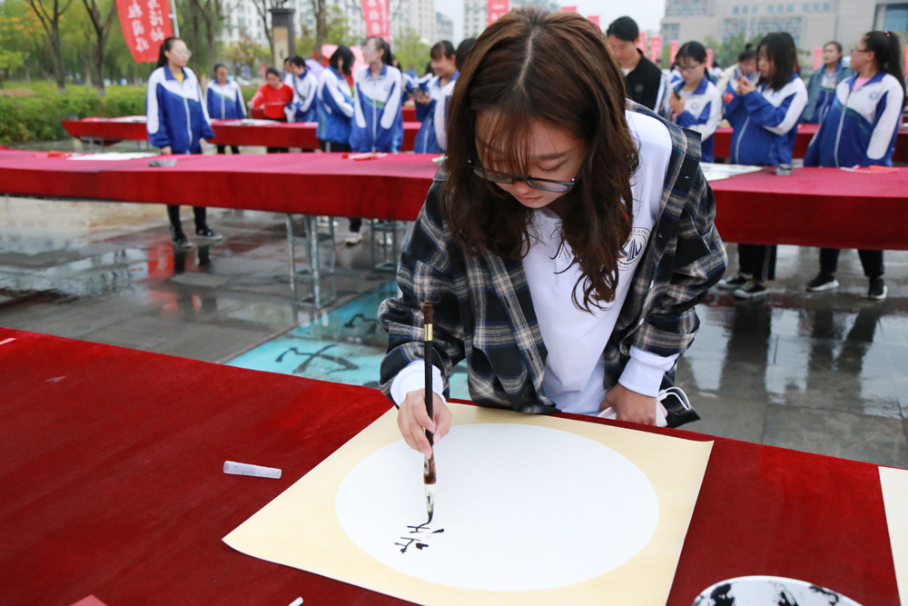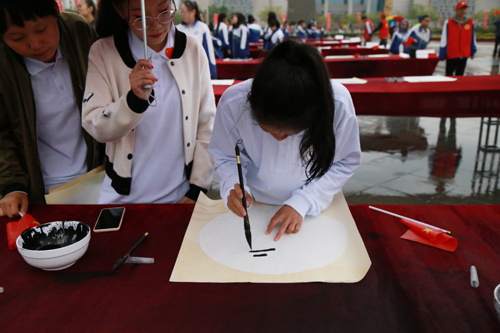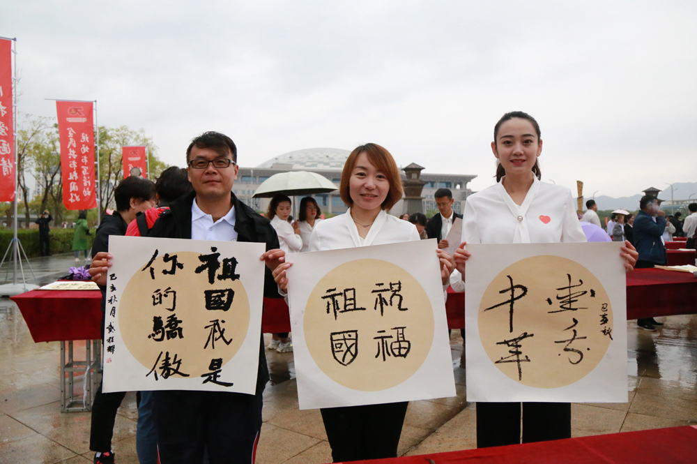 虽然现场小雨阵阵,但丝毫不减师生们以书法祝福祖国的热情,师生们以浓墨礼赞、祝福祖国。书写活动完成后,师生们大声歌唱《我和我的祖国》,用优美的歌声庆祝中华人民共和国成立70周年。