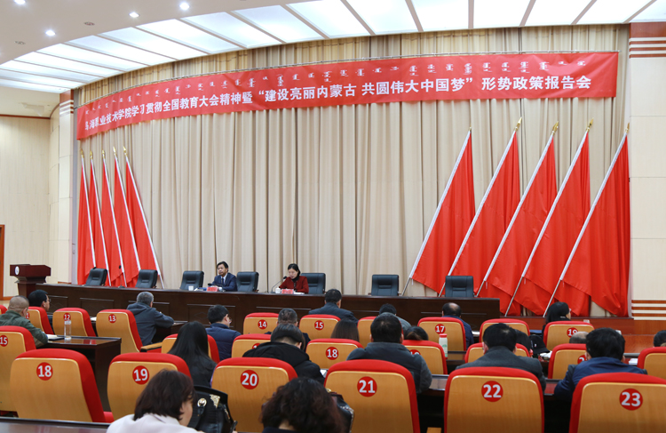 11月22日下午,星空电竞app下载苹果版安装召开学习贯彻全国教育大会精神暨“建设亮丽内蒙古 共圆伟大中国梦”形势政策报告会。学院党委副书记、院长牟占军以《学习贯彻全国教育大会精神 推动我院星空彩票app官方版安装下载高质量发展》为题作了精彩的报告。学院领导班子成员、全院教职员工及部分学生代表聆听报告。报告会由学院党委副书记、纪委书记、宣传部长侯丽敏主持。