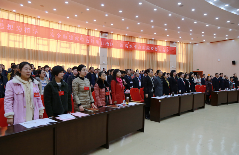 本次大会的主题是:以习近平新时代中国特色社会主义思想为指导,深入学习贯彻党的十九大精神,认真落实全国教育大会精神和全国、全区高校思想政治工作会议精神,坚持社会主义办学方向,落实立德树人根本任务,全面加强党的领导,团结带领全院师生员工,聚焦职教改革,推动内涵发展,为把我院全面建设成为特色鲜明自治区一流高水平职业院校而努力奋斗!