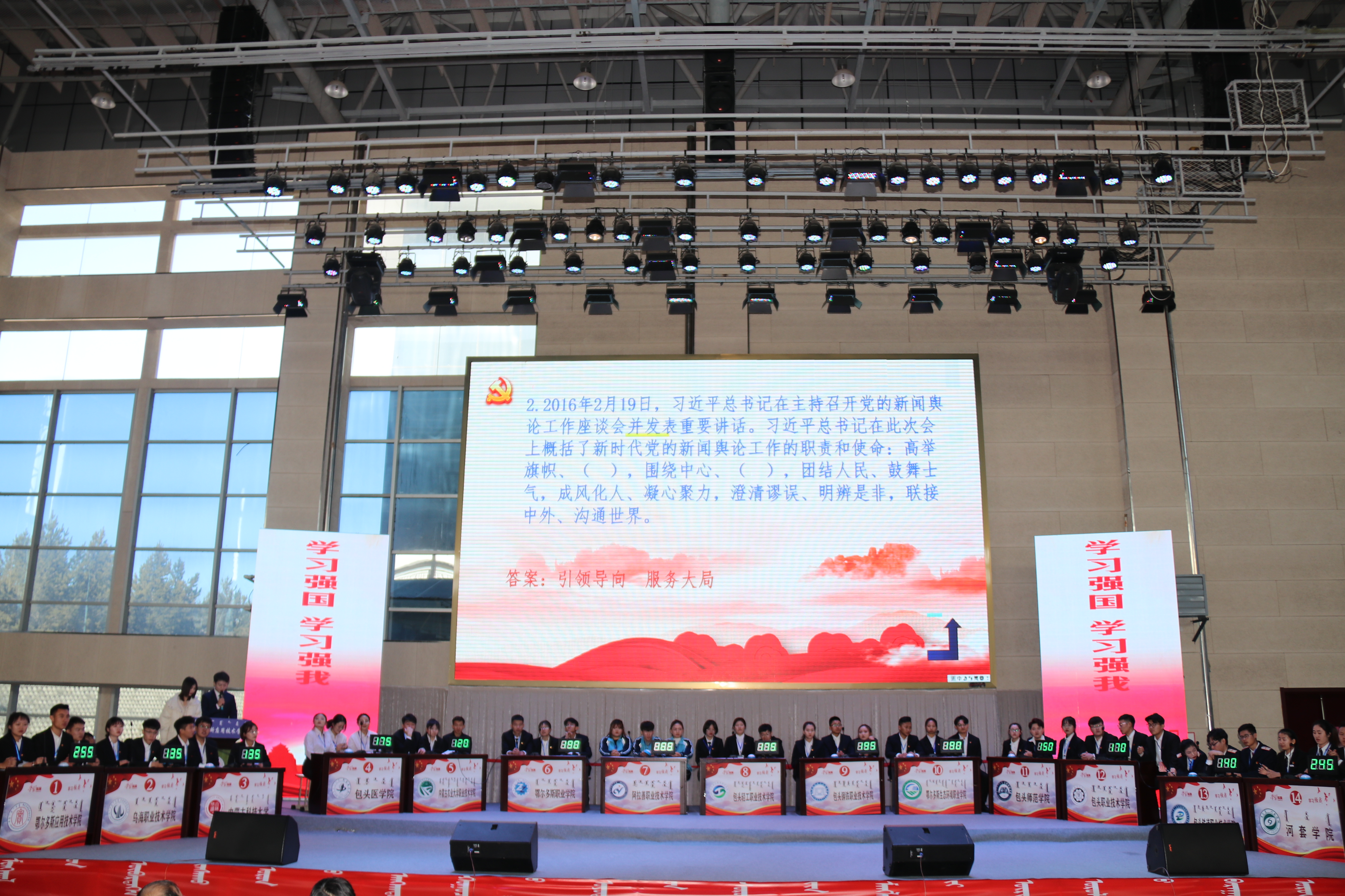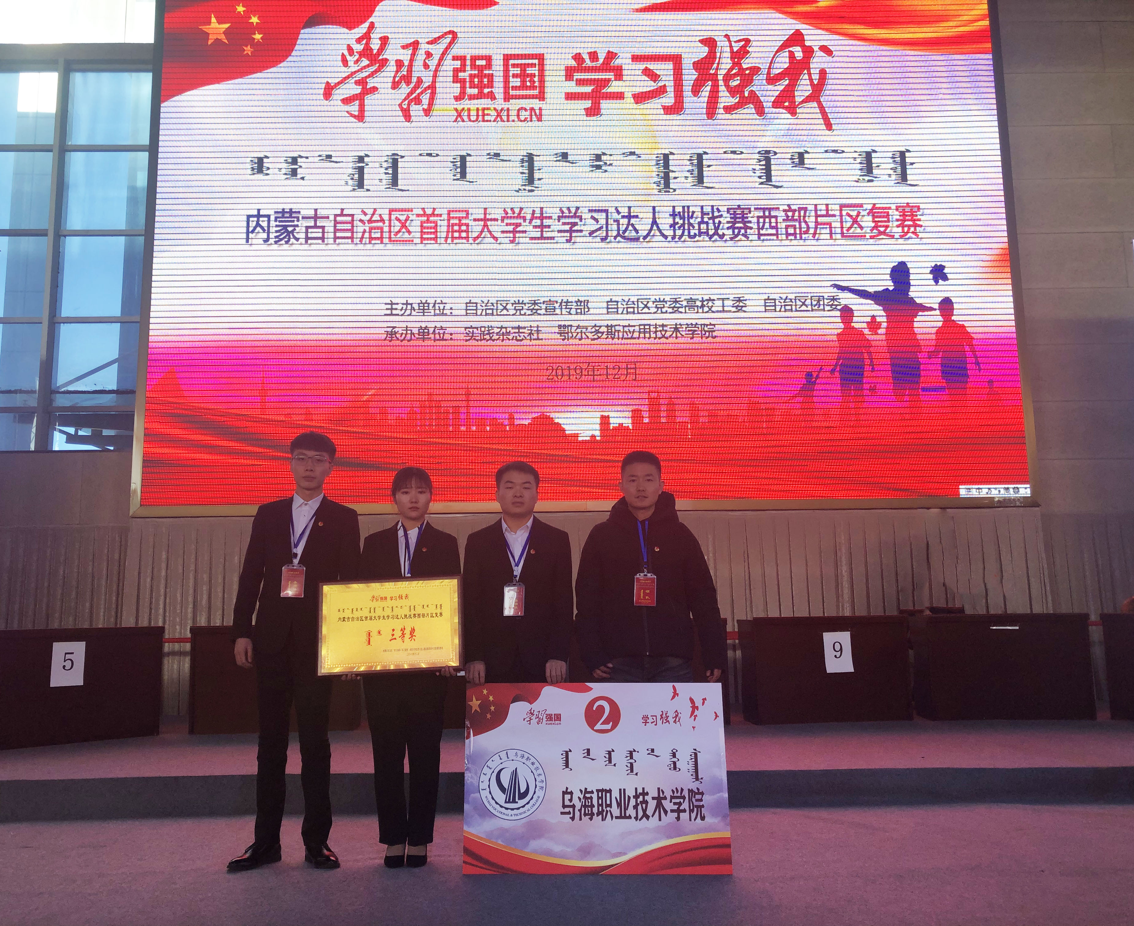 12月4日上午,内蒙古第二届大学生文化艺术活动“学习强国·学习强我”全区大学生学习达人知识竞赛西部赛区复赛在鄂尔多斯举行,我院选派机电工程系高翔、管理与旅游系刘通、学前教育系娜荷芽3名学生组队参赛。