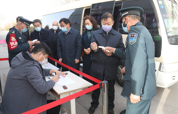 窦贵君一行来到学院后,在执勤门岗处作了登记,并测量了体温。我院党委书记薛文和党委副书记、院长牟占军详细介绍了疫情防控工作机制、人员管理、防控管理、网络线上教学的情况,特别介绍了开学前的防控知识培训、消杀防疫物资储备、疾控专业人员配备、餐饮住宿安排等情况。