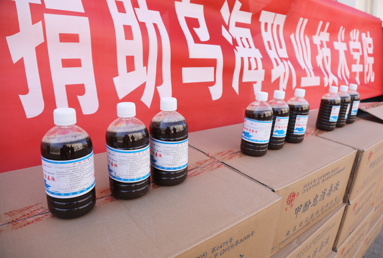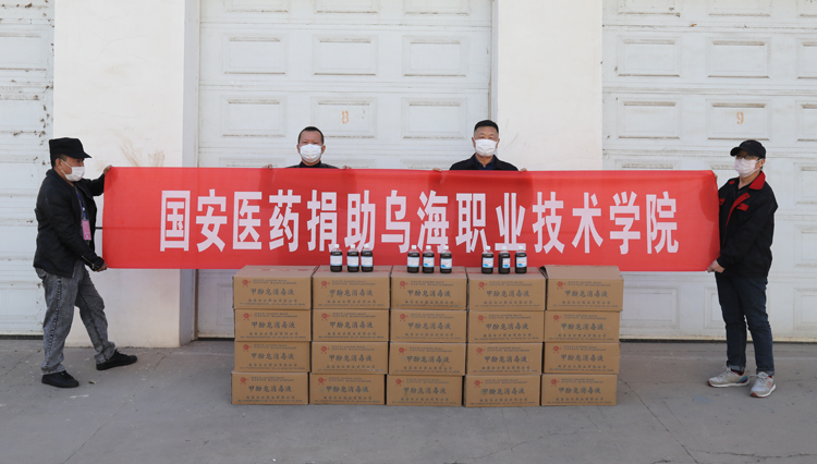 3月20日上午,乌海市国安医药公司代表来到我院,为支持春季学期开学前后的新冠肺炎疫情防控消杀物资储备,保障学生的正常学习生活,特捐赠600瓶甲酚皂消毒液,总价值5400元。(陈宇)
