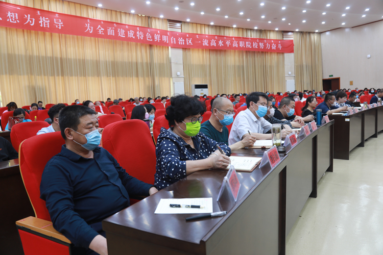 薛文强调,要深入贯彻落实全区教育系统全面从严治党工作视频会议精神,坚持把政治建设摆在首位,坚持把思想建设作为引领,坚持把人才强校作为根本,坚持把组织建设作为基础。要深入学习贯彻落实全国高校思想政治工作会议精神和学校思想政治理论课教师座谈会精神,着力构建“三全育人”工作体系,全面加强思政课程建设。他特别对加强内涵建设提出了下一步的工作方向,要全面启动职业本科申报工作,着力推进专业建设高质量均衡发展,全面提升学院规范化、精细化、科学化管理水平。要全力做好今年的招生就业工作,畅通生源渠道,提升生源质量,深入开展招生与招工一体化工作。进一步创新工作模式、拓宽就业渠道,精准开展“云指导”“云服务”,确保毕业生顺利毕业就业。他还对学生公寓楼、综合服务楼、综合教学楼等建设项目作出部署,要求立足“快”字争主动,倒排工期、挂图作战,确保项目按期推进、如期建成。要协调推进职业技能公共实训基地的二期建设任务,做好体育中心的接收和管理,推进后勤服务社会化。