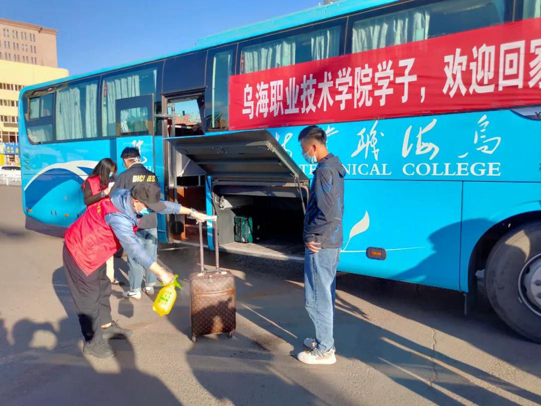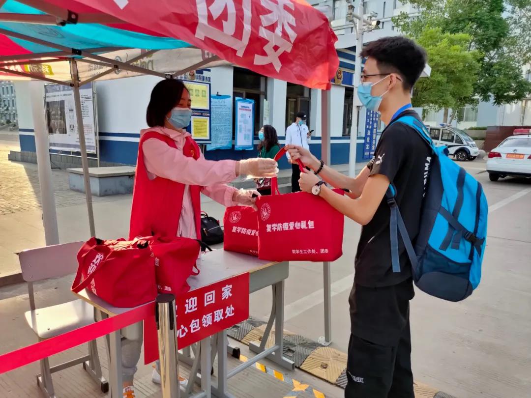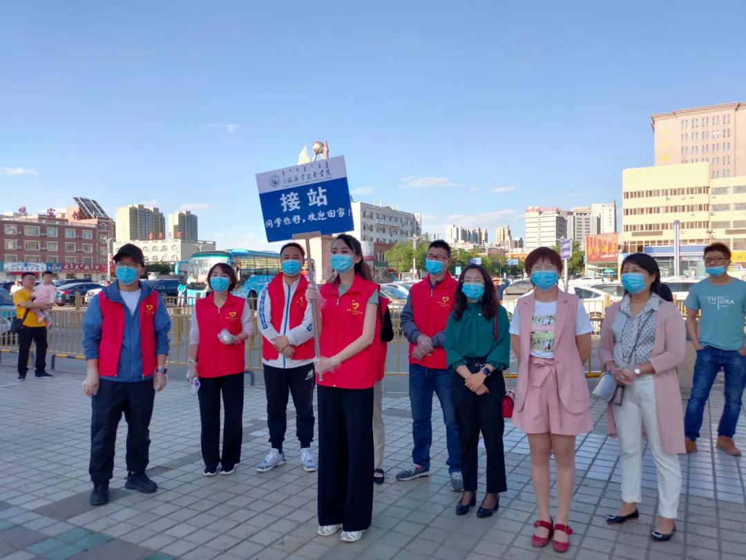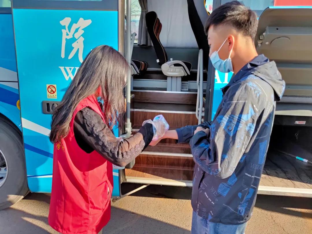 为迎接学生安全返校,学院安排专门车辆到火车站做好接站服务,“点对点”接送返校学生直达学校。返校学生在志愿者老师的引导下,严格按照“一核二消三测四上车”的要求,积极配合测量体温,全方位进行了消毒。