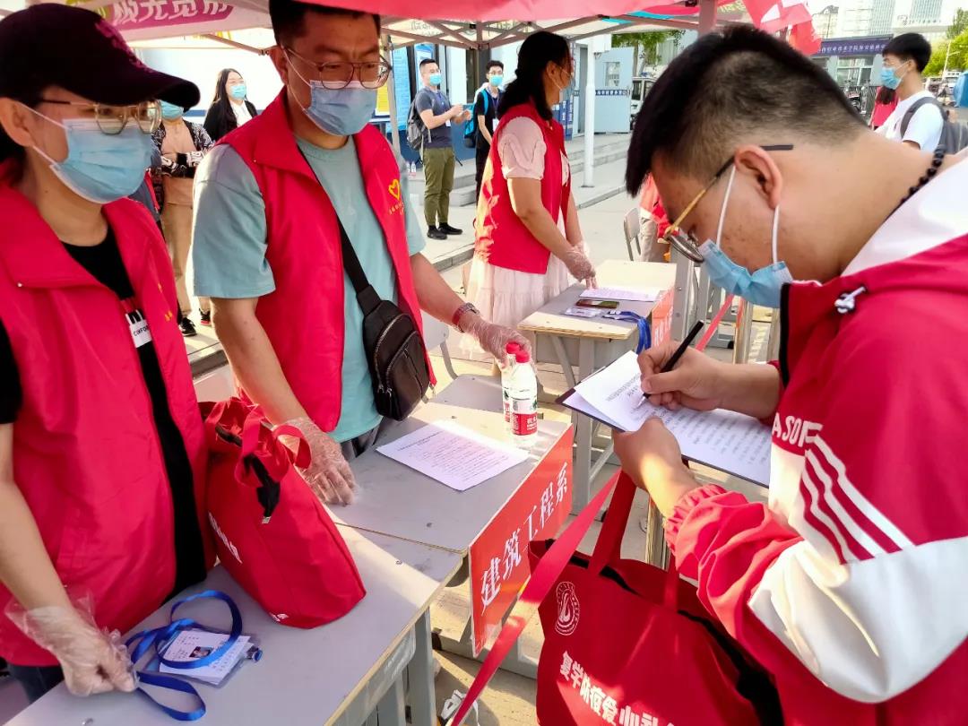 学院门口,返校学生二次进行各项防疫检查,即行李消毒、身份核验、体温检测、扫码报到、签署承诺书、领取出入证与复学返校爱心大礼包等。一道道防疫程序,为返校学生安全返校筑起一道道防线。