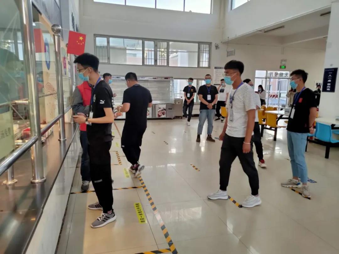 为了保证返校学生的就餐安全,学院对餐厅也进行了充足的准备,不但对卫生进行消杀和维护,还在门口摆放着免洗洗手液,地面上粘贴了引导和间隔标识,同时配备工作人员引导就餐。据了解,学生返校后,为切实做好学生的饮食安全,学院还安排了每餐不少于3位领导干部进行陪餐。