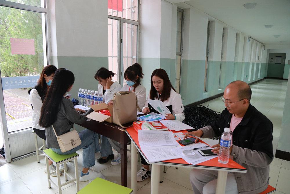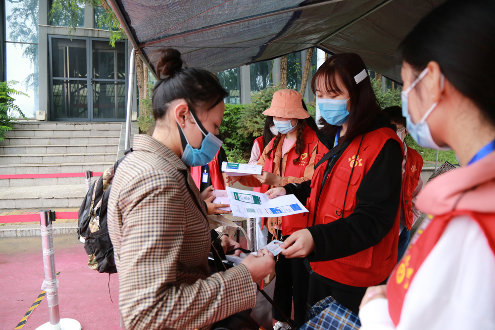 学院门口,返校学生在工作人员及志愿者的亲切指引下,保持一米以上安全间隔有序排队进入专业通道,依次进行体温测量、健康码核验、查看14天个人行程轨迹单、个人信息查验等流程,审核通过后进入公寓楼办理入住手续,领取胸卡、体温计等相关物品。