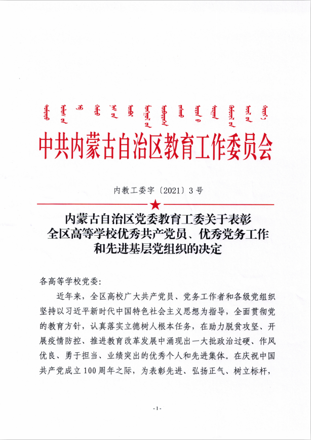 近日,中共内蒙古自治区教育工作委员会印发《关于表彰全区高等学校优秀共产党员、优秀党务工作者和先进基层党组织的决定》,从全区高校中表彰了50名优秀共产党员、50名优秀党务工作者和50个先进基层党组织。